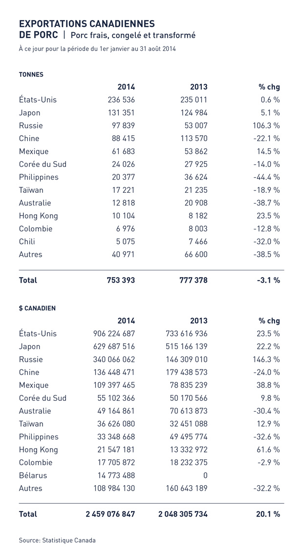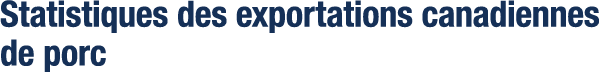Chaque mois, CPI publie une mise à jour des exportations canadiennes de porc dans les principaux marchés du Canada, en volume et en valeur ainsi que le pourcentage de changement par rapport à l'année précédente. Ces informations sont compilées par Statistique Canada et préparées par la Section de la viande rouge d'Agriculture et Agroalimentaire Canada.